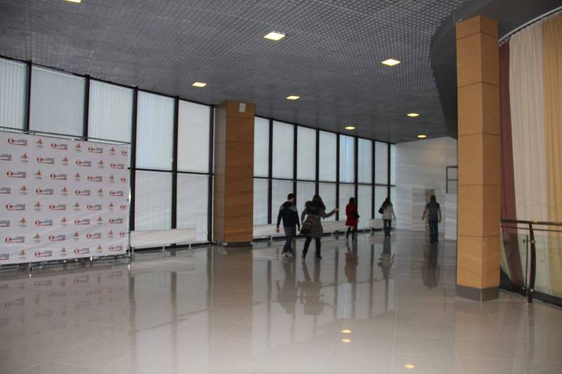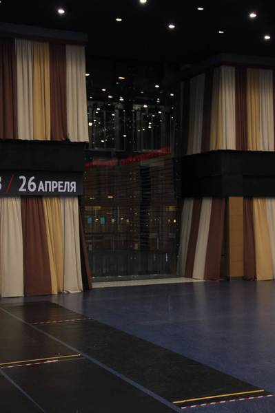 Во время нашего посещения зрительские трибуны были сложены. На фотографиях это выглядит как «деревянная стенка с горизонтальными полосами».